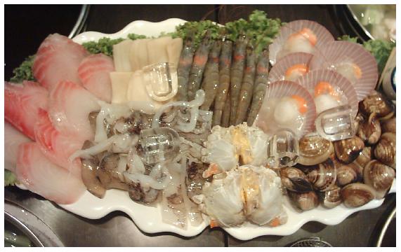 加點的海鮮料,有鯛魚片.蝦子.花枝.蟹寶.扇貝.蛤仔等等挺多的玩意兒