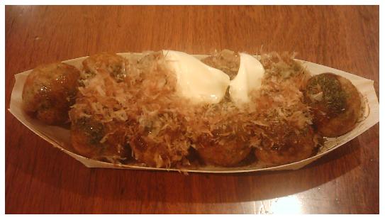 章魚燒每顆的份量比外頭的size大多了,熱燙燙咬下去裡頭麵糊有拌入海苔粉,所以是淡綠色的