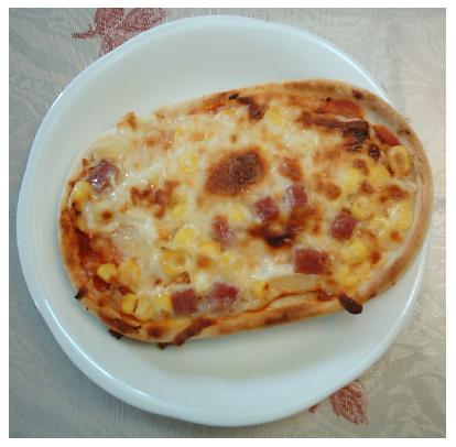 烤了八分鐘後的成果,挺漂亮的,其實吃起來味道很簡單,就是披薩