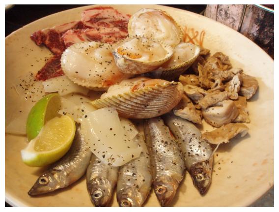 該是來個嚇人海鮮盤的時候了,只是不知道為啥要加兩塊肉呢?這樣很不漂亮耶..