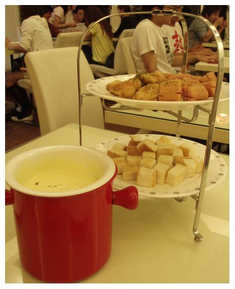 起司鍋這會殺死我們的玩意!這可怎麼行!紅色的小爐子下面有蠟燭小小的加熱讓起司維持