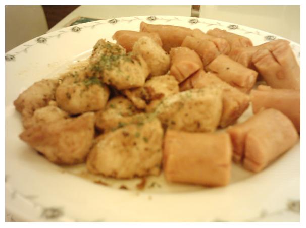 一份起司鍋會附上異國風味肉盤+麵包盤,肉盤上的東西都很鹹,但是有先調味過的雞肉