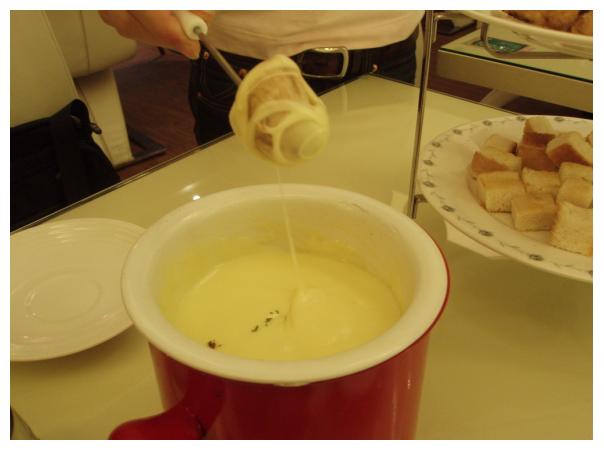 喔~~~~牽絲的起司看了真的很舒服~~~起司鍋裡的起司味道是像芝心pizza裡面那層