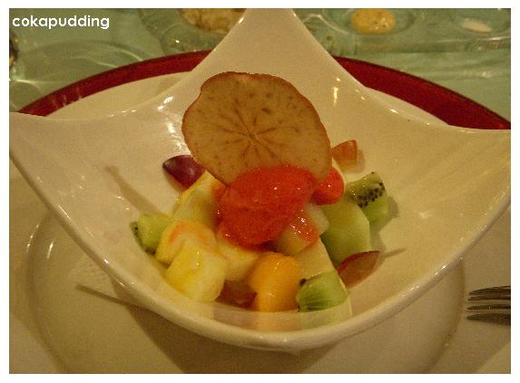 水果雪碧沙拉,這好吃,所有水果沾上點冰涼的覆盆子冰沙,酸中帶甜有開胃,上面那片乾脆的糖蘋果片我好喜歡