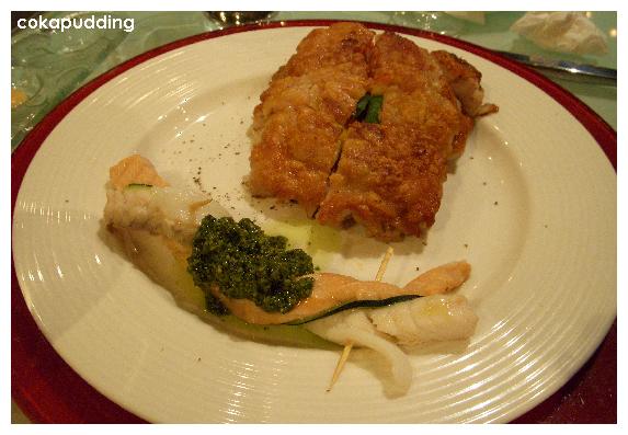 普羅旺斯雞排海鮮雙拼,雞排是大廚最早開始料理的菜色,煎的金黃油亮,好像用炸過的一樣