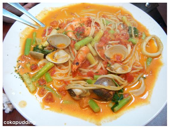 番茄海鮮義大利麵,這個我覺得挺划算的,因為料挺多的還有蘆筍~不過它的蕃茄醬汁