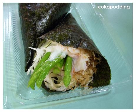 所以有我喜歡的手捲~裡頭很豐盛有蝦子蘆筍柴魚片香鬆高麗菜絲跟-滿滿美奶滋~喔耶~