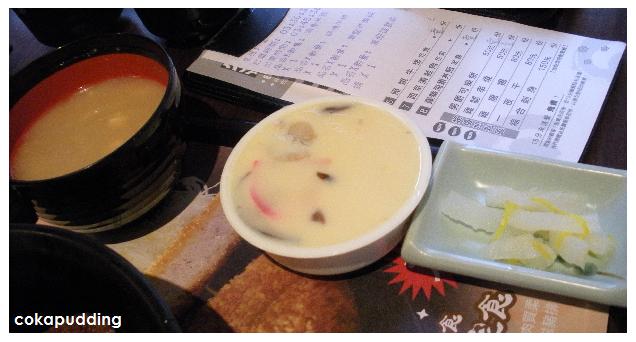 還有可以一直續的味增湯,跟爭鮮壽司一樣的有料蒸蛋,和一小牒小菜,今天剛好是我沒特別喜歡的