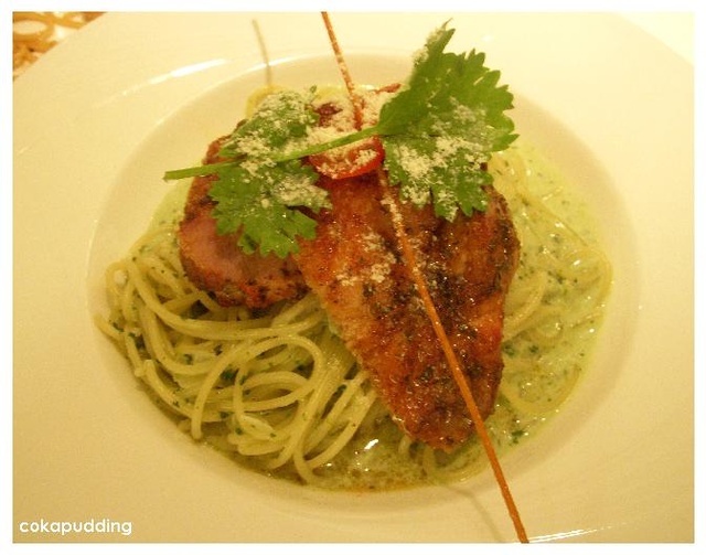 L點了青醬奶油雞腿麵$220,麵條也是不錯吃(好啦,我喜歡)醬有點稀,奶味也沒有很重
