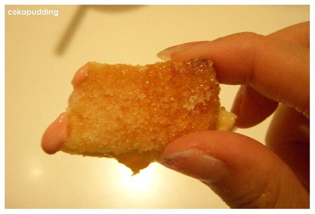 其實重點是裡頭的土司會挖出來切塊炸過之後灑上一層砂糖,吃起來香甜酥脆