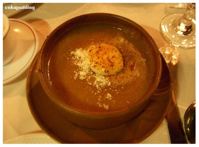店裡燈光很昏暗,我的相機罩不住...洋蔥湯非常濃,洋蔥也好多,加上裡頭還有麵包