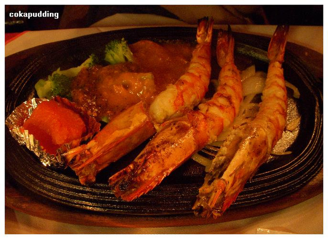三尾放上去看起來比我們的牛排多耶!哈哈!肉質很有彈性~味道很不錯,挺好吃的
