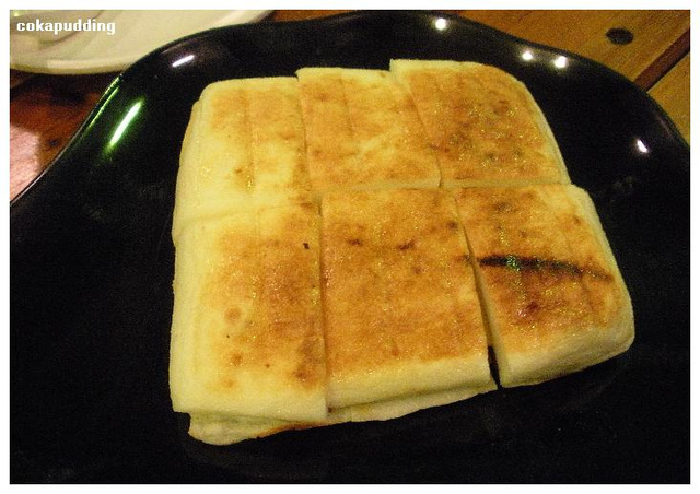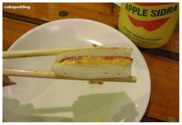 兩塊鱈魚豆腐(有點像火鍋料),烘烤的澎鬆溫熱,裡頭夾了起司跟火腿