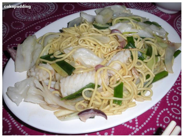這是海鮮炒麵,名字就讓我自己取吧~還不錯吃,花枝給挺多的