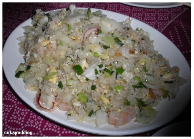 三鮮炒飯,也是我取的名字,裡頭一樣有花枝還有蝦子,味道挺鮮的,但不會太鹹