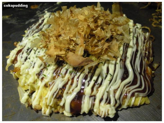 是有厚厚一層麵糊跟蔬菜在裡頭的,會刷醬汁擠上美奶滋還有撒上柴魚片~這個因為出現在最後加點