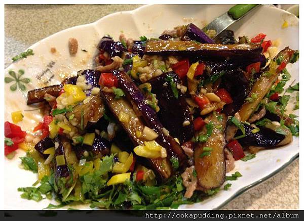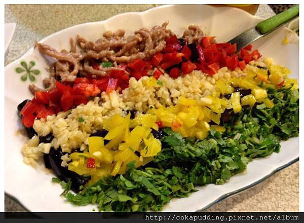 結果這彩虹茄子也是涼拌菜的一種哦!紅椒.黃椒.蒜頭.香菜以及肉絲鋪在上頭