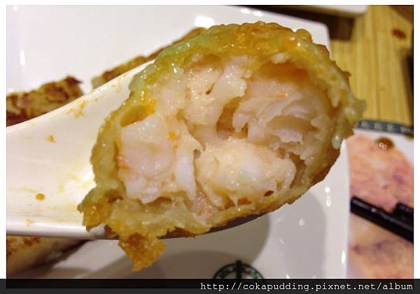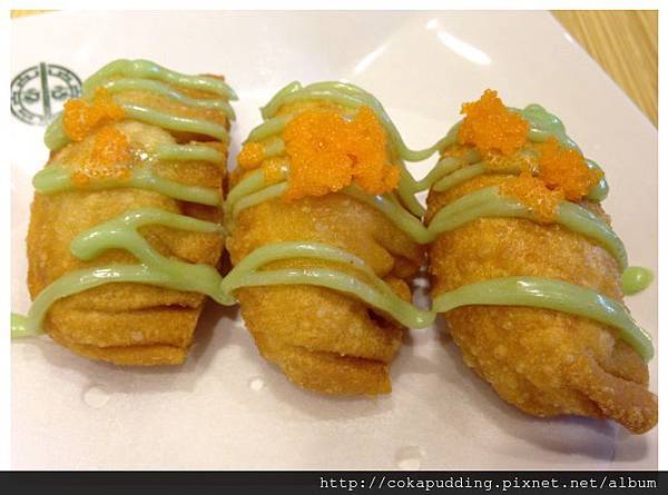 我沒有認真看圖所以送上來一度以為是炸鹹水餃..綠色的美乃滋是芥末味的但不那麼嗆,上頭還有蝦卵