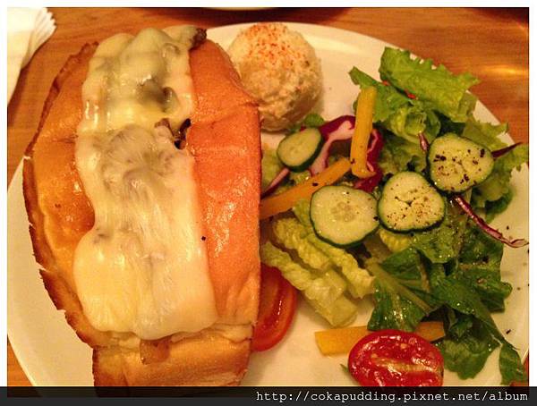 裡頭是炒洋蔥蘑菇跟薄牛肉片,醬汁有點日系甜甜的還蠻好吃的,她很推崇這個厚吐司麵包的口感