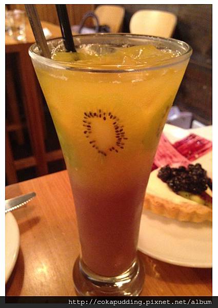 裡面是葡萄汁+鳳梨汁+奇異果片,我拍不出漂亮的漸層感~ 因為新鮮水果的關係會有點刺刺的(鳳梨咬嘴?)