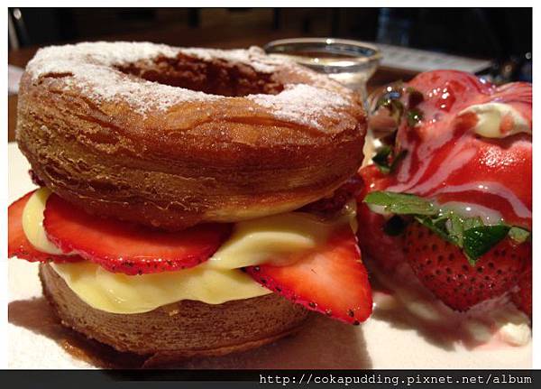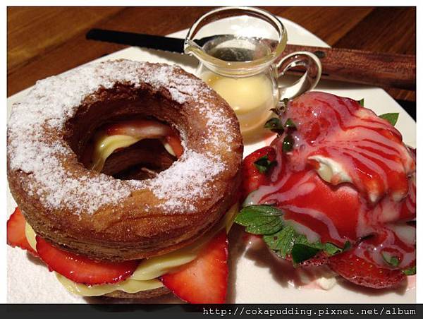 可拿滋就是可頌+多拿滋(甜甜圈)的合體版,圓形的可頌中間夾餡料啦!旁邊附上了草莓冰淇淋鮮奶油煉乳跟草莓