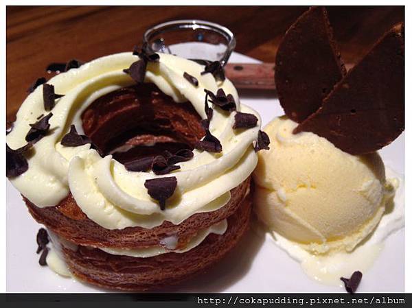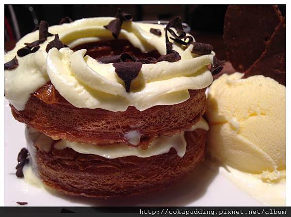 圓型本體的口感酥脆,切開也是一層層的,吃來是烤好溫熱的,所以沾冰淇淋挺不賴