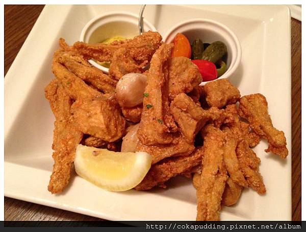 搭配芥末醬&酸黃瓜解膩用,加上大蒜整顆下去炸,其實還是有點油幸好還有檸檬