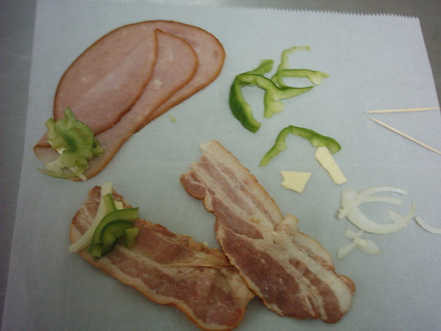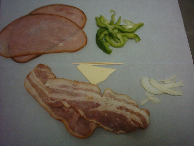 食材為火腿片*2 培根條*2 洋蔥青椒起司少許
