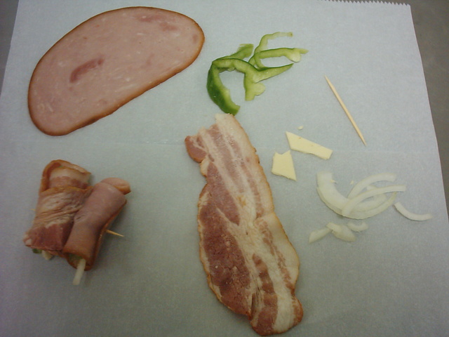 食材為火腿片*2 培根條*2 洋蔥青椒起司少許將火腿片對折1/3,培根條攤開翻平無皺折