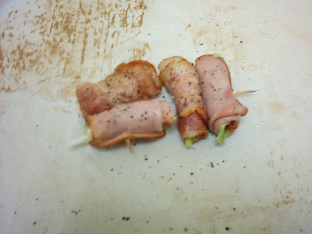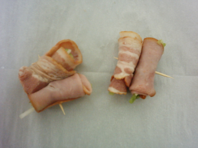 用牙籤串起,一根牙籤可串2捲經測試由"烤培根捲"拔得頭籌! 而"火腿捲"位居第2